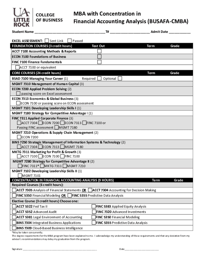 MBA with Concentration in Financial Accounting Analysis (BUSAFACMBA) Student Name ___T# ___ Admit Date ___ EXCEL ASSESSMENT: Sent Link Passed FOUNDATION COURSES (3 credit hours) Test Out Term ACCT