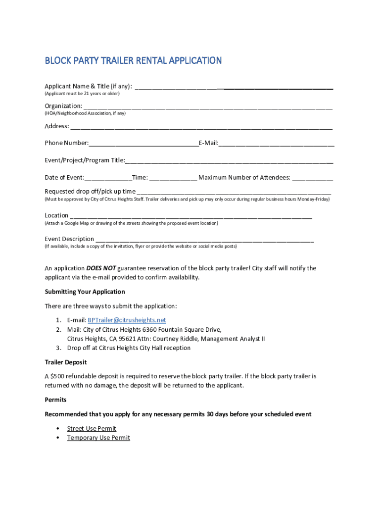 BLOCK PARTY TRAILER RENTAL APPLICATION Applicant Name & Title (if any): ___ (Applicant must be 21 years or older)___Organization: ___ (HOA/Neighborhood Association, if any)Address: ___ Phone Number:_