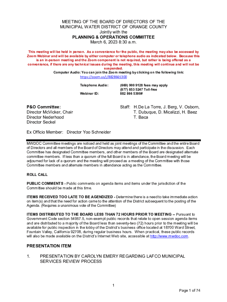 MEETING OF THE BOARD OF DIRECTORS OF THE MUNICIPAL WATER DISTRICT OF ORANGE COUNTY Jointly with the PLANNING & OPERATIONS COMMITTEE March 6, 2023 8:30 a.m. This meeting will be held in person. As