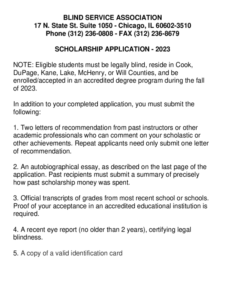 BLIND SERVICE ASSOCIATION 17 N. State St. Suite 1050 Chicago, IL 606023510 Phone (312) 2360808 FAX (312) 2368679 SCHOLARSHIP APPLICATION 2023 NOTE: Eligible students must be legally blind, reside