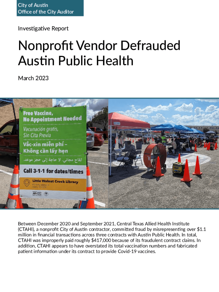 City of Austin Office of the City AuditorInvestigative ReportNonprofit Vendor Defrauded Austin Public Health March 2023Between December 2020 and September 2021, Central Texas Allied Health Institute
