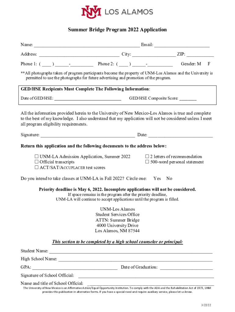 Summer Bridge Program 2022 Application Name: ___ Email: ___ Address: ___ City: ___ ZIP: ___ Phone 1: (___) ______ Phone 2: (___) ______Gender: MF**All photographs taken of program participants become