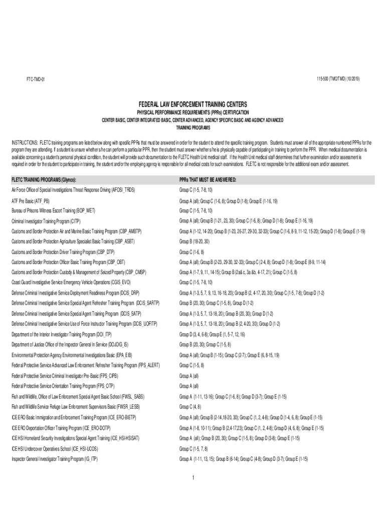 115500 (TO/TMD) (10/2019)FTCTMD01FEDERAL LAW ENFORCEMENT TRAINING CENTERS PHYSICAL PERFORMANCE REQUIREMENTS (GPRS) CERTIFICATION CENTER BASIC, CENTER INTEGRATED BASIC, CENTER ADVANCED, AGENCY SPECIFIC