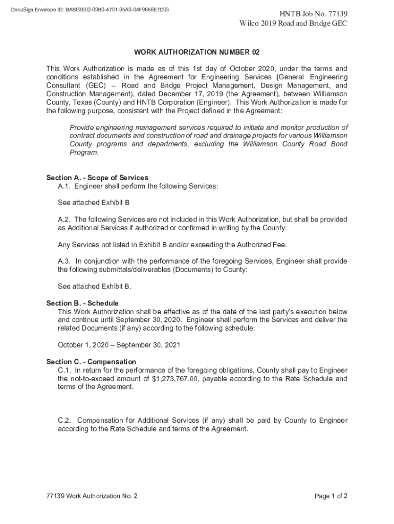 HTB Job No. 77139 Wilcox 2019 Road and Bridge NETWORK AUTHORIZATION NUMBER 02 This Work Authorization is made as of this 1st day of October 2020, under the terms and conditions established in the