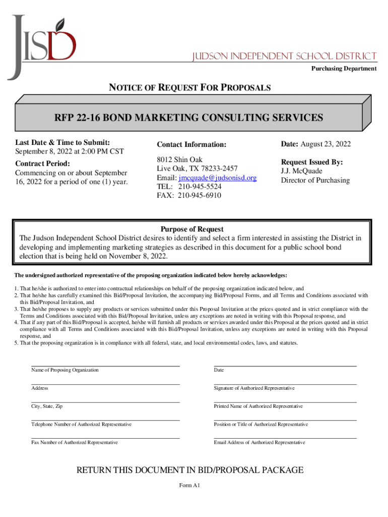 Judson independent school district Purchasing DepartmentNOTICE OF REQUEST FOR PROPOSALS RFP 2216 BOND MARKETING CONSULTING SERVICES Last Date & Time to Submit: September 8, 2022, at 2:00 PM CST Contract
