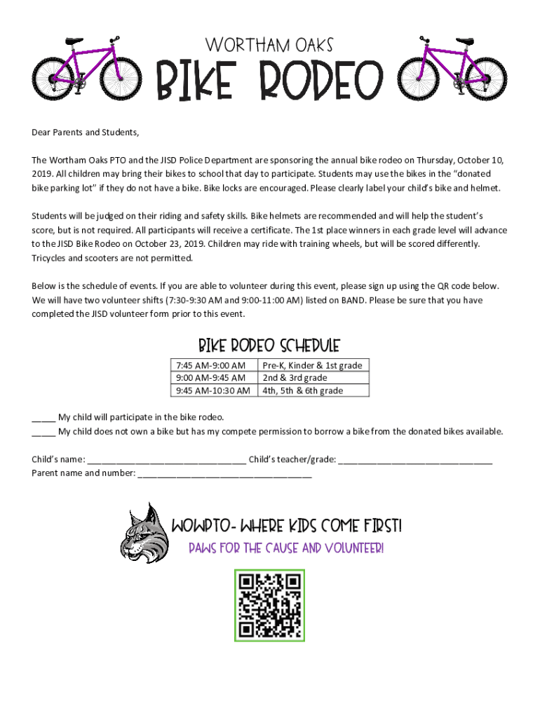 WORTH AM Oakdale Parents and Students, The Wort ham Oaks PTO and the GISD Police Department are sponsoring the annual bike rodeo on Thursday, October 10, 2019. All children may bring their bikes to