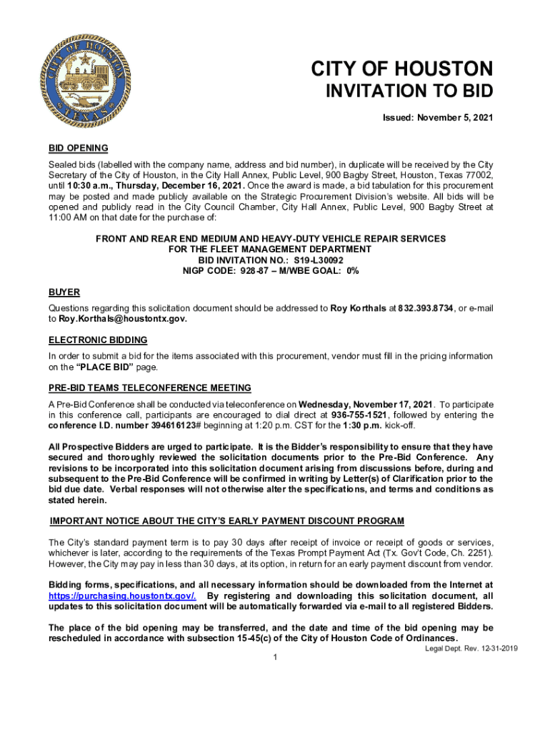 CITY OF HOUSTONINVITATION TO BID Issued: November 5, 2021BID OPENING Sealed bids (labelled with the company name, address and bid number), in duplicate will be received by the City Secretary of the