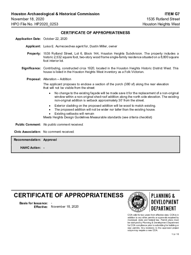 Houston Archaeological & Historical Commission November 18, 2020, HBO File No. HP2020_0253ITEM G7 1535 Jutland Street Houston Heights WestCERTIFICATE OF APPROPRIATENESS Application Date: October 22,