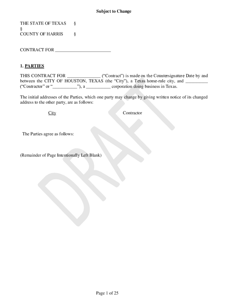 Subject to Change THE STATE OF TEXAS COUNTY OF HARRIS CONTRACT FOR ___1. PARTIES THIS CONTRACT FOR ___ (Contract) is made on the Countersignature Date by and between the CITY OF HOUSTON, TEXAS (the