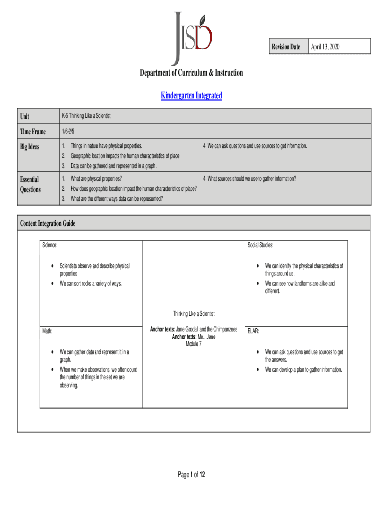 Revision Date April 13, 2020Department of Curriculum & Instruction Kindergarten Integrated UnitK5 Thinking Like a ScientistTime Frame1/62/5Big Ideas1. Things in nature have physical properties.2.