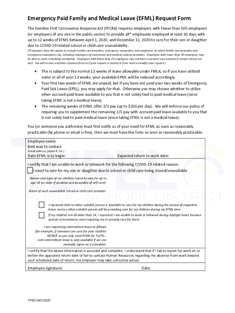 Get the free Emergency Paid Family and Medical Leave (EFML) Request Form