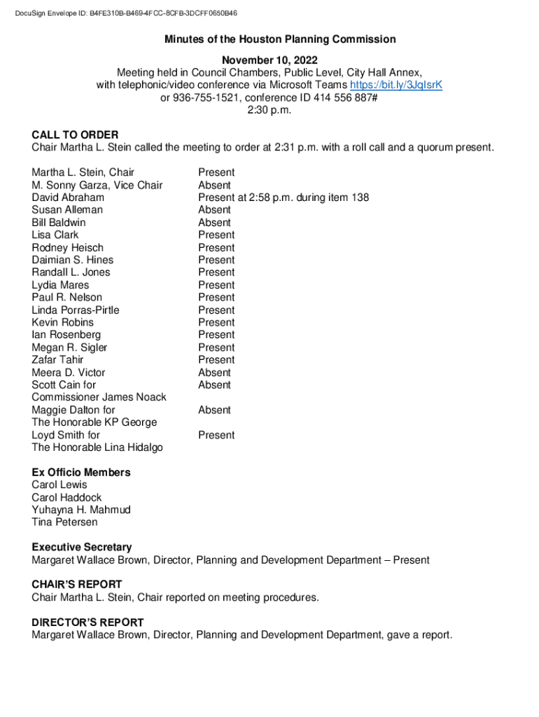 DocuSign Envelope ID: B4FE310BB4694FCC8CFB3DCFF0650B46Minutes of the Houston Planning Commission November 10, 2022, Meeting held in Council Chambers, Public Level, City Hall Annex, with telephonic/video