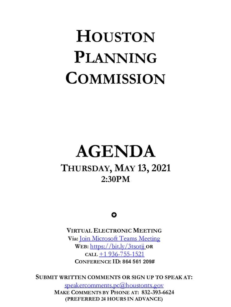 HOUSTON PLANNING COMMISSIONAGENDA THURSDAY, MAY 13, 2021 2:30PM VIRTUAL ELECTRONIC MEETING Via: Join Microsoft Teams Meeting WEB: https://bit.ly/3tsotjj OR CALL +1 9367551521 CONFERENCE ID: 864 561