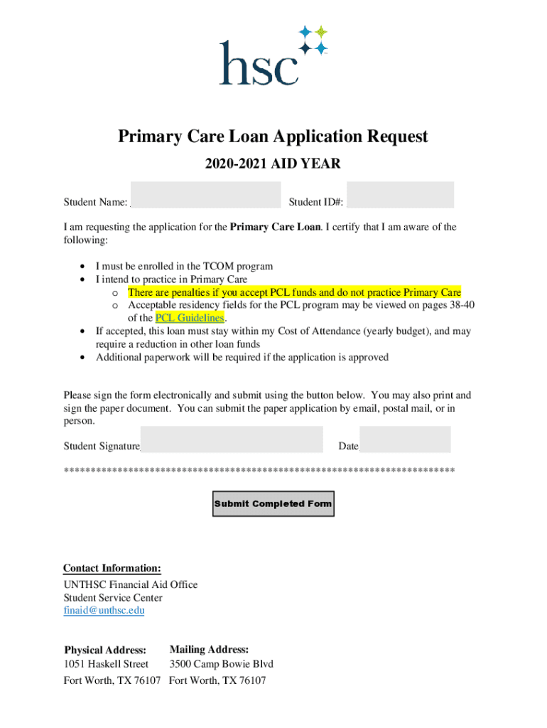Primary Care Loan Application Request 20202021 AID YEAR Student Name: ___ Student ID#: ___ I am requesting the application for the Primary Care Loan. I certify that I am aware of the following: I