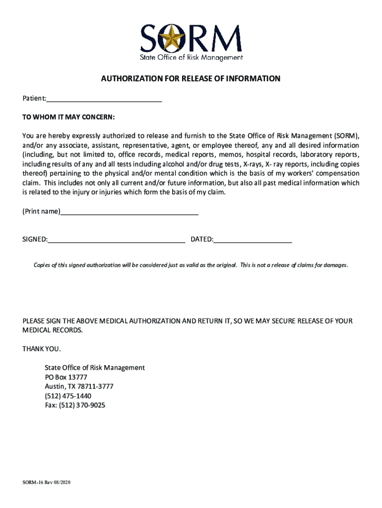 AUTHORIZATION FOR RELEASE OF INFORMATION Patient:___ TO WHOM IT MAY CONCERN: You are hereby expressly authorized to release and furnish to the State Office of Risk Management (FORM), and/or any associate,