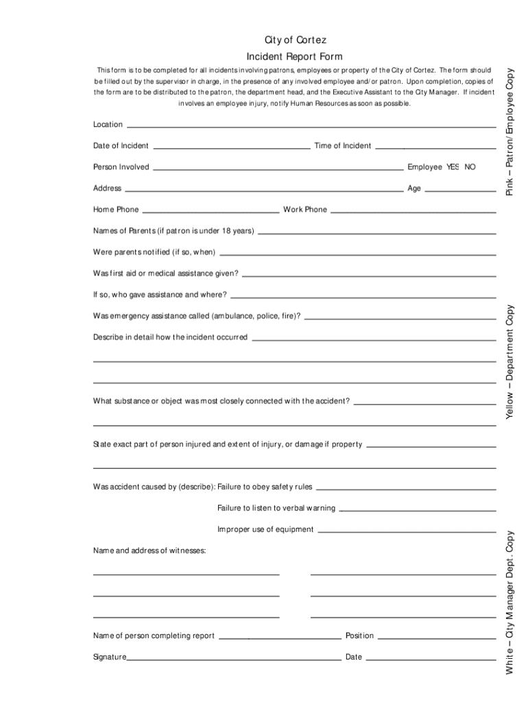 This form is to be completed for all incidents involving patrons, employees or property of the City of Cortez. The form should be filled out by the supervisor in charge, in the presence of any involved