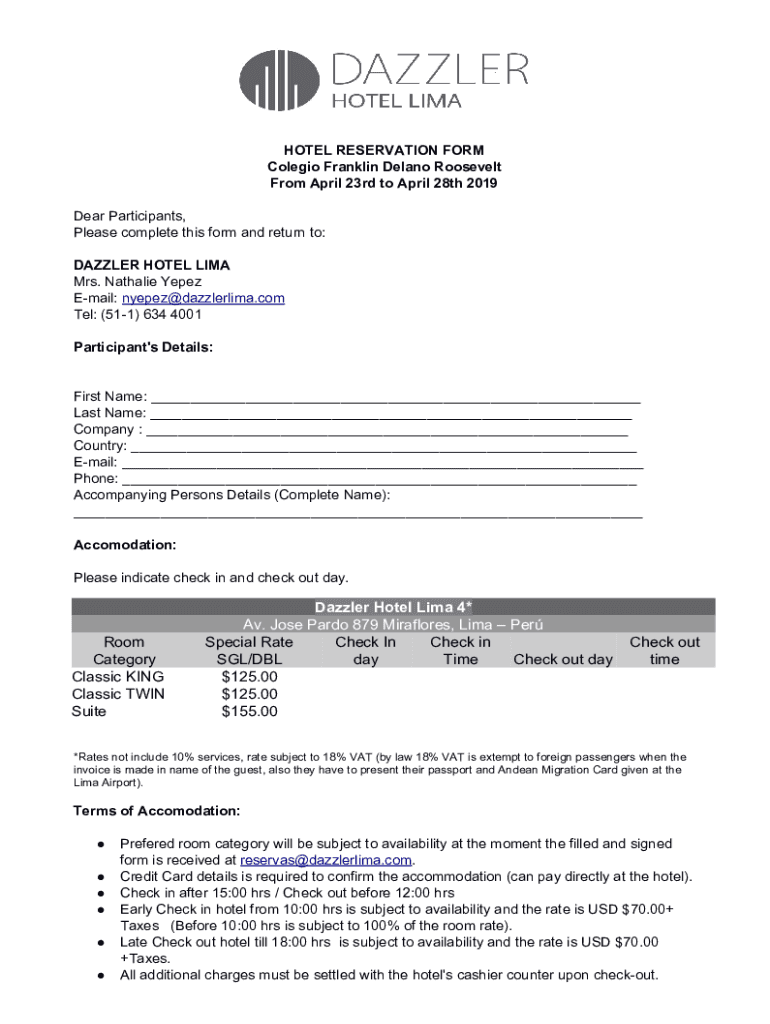 HOTEL RESERVATION FORM Colegio Franklin Delano Roosevelt From April 23rd to April 28th 2019 Dear Participants, Please complete this form and return to: DAZZLER HOTEL LIMA Mrs. Nathalie Lopez Email: