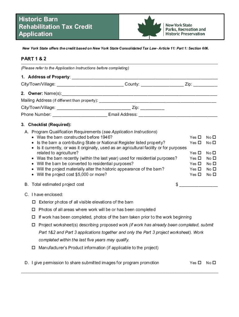 Historic Barn Rehabilitation Tax Credit Application New York State offers the credit based on New York State Consolidated Tax Law Article 11: Part 1: Section 606.PART 1 & 2 (Please refer to the Application