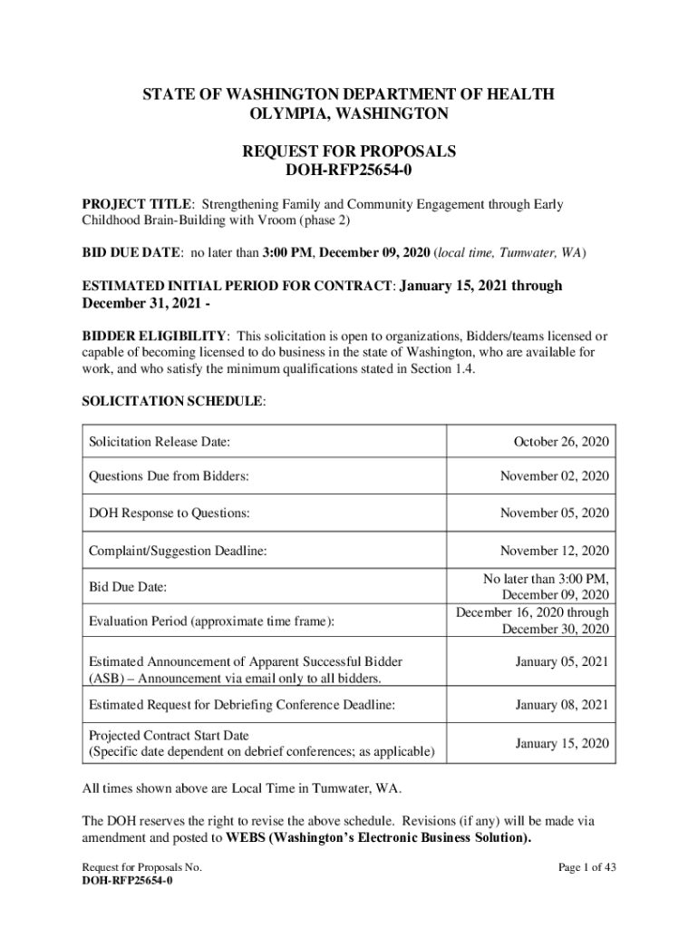 STATE OF WASHINGTON DEPARTMENT OF HEALTH OLYMPIA, WASHINGTON REQUEST FOR PROPOSALS DOHRFP256540 PROJECT TITLE: Strengthening Family and Community Engagement through Early Childhood BrainBuilding with