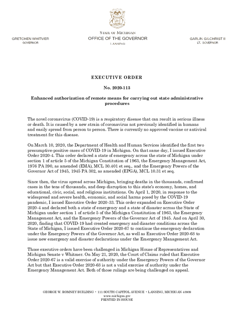 6i. Tl/DO\'%\'e _.\'S TAT E O F M IC HIGANGRETC HEN W H IT M OFFICE OF THE GOVERNORGARLIN G ILC H LIST GOVERN ORL ANSI GLT. GOVERNOREXECUTIVE ORDER No. 2020113 Enhanced authorization of remote means