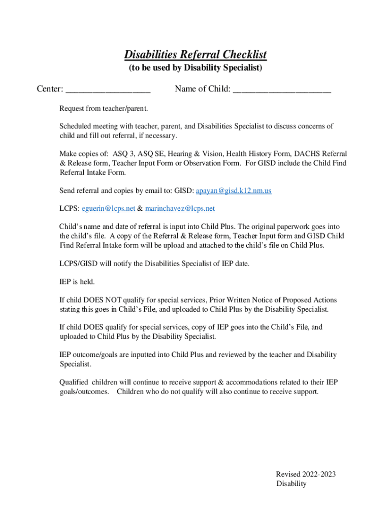 Disabilities Referral Checklist (to be used by Disability Specialist) Center: ___Name of Child: ___Request from teacher/parent. Scheduled meeting with teacher, parent, and Disabilities Specialist