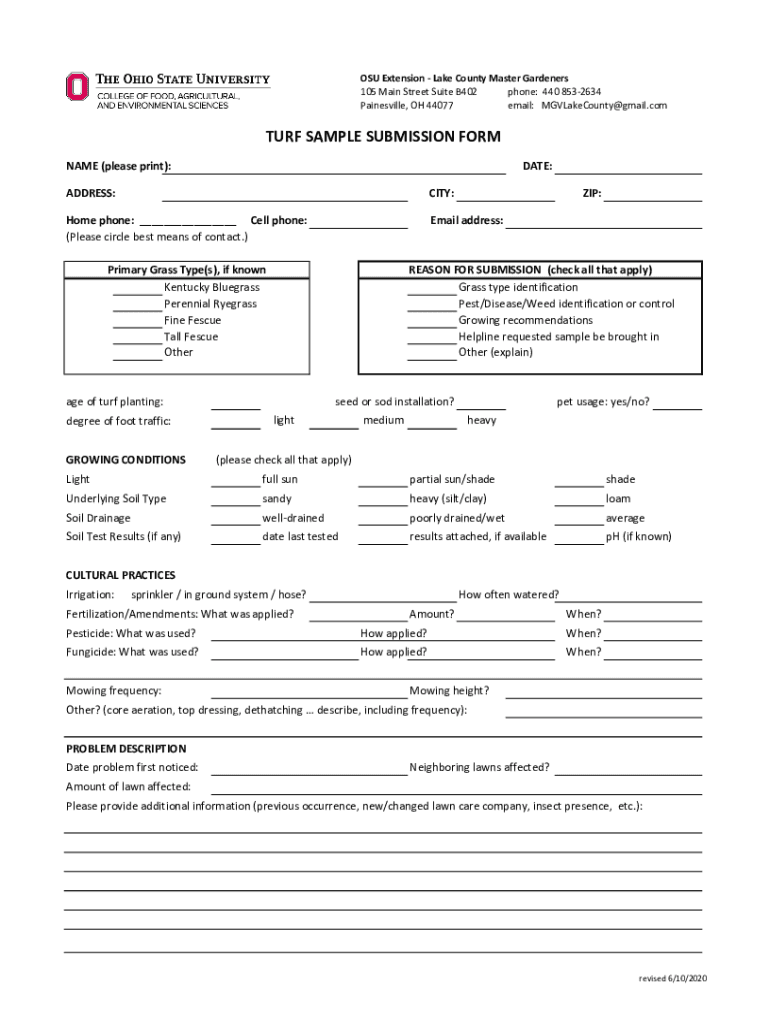 OSU Extension Lake County Master Gardeners 105 Main Street Suite B402 phone: 440 8532634 Painesville, OH 44077 email: MGVLakeCounty@gmail.comTURF SAMPLE SUBMISSION FORM NAME (please print):DATE:ADDRESS:CITY:Home