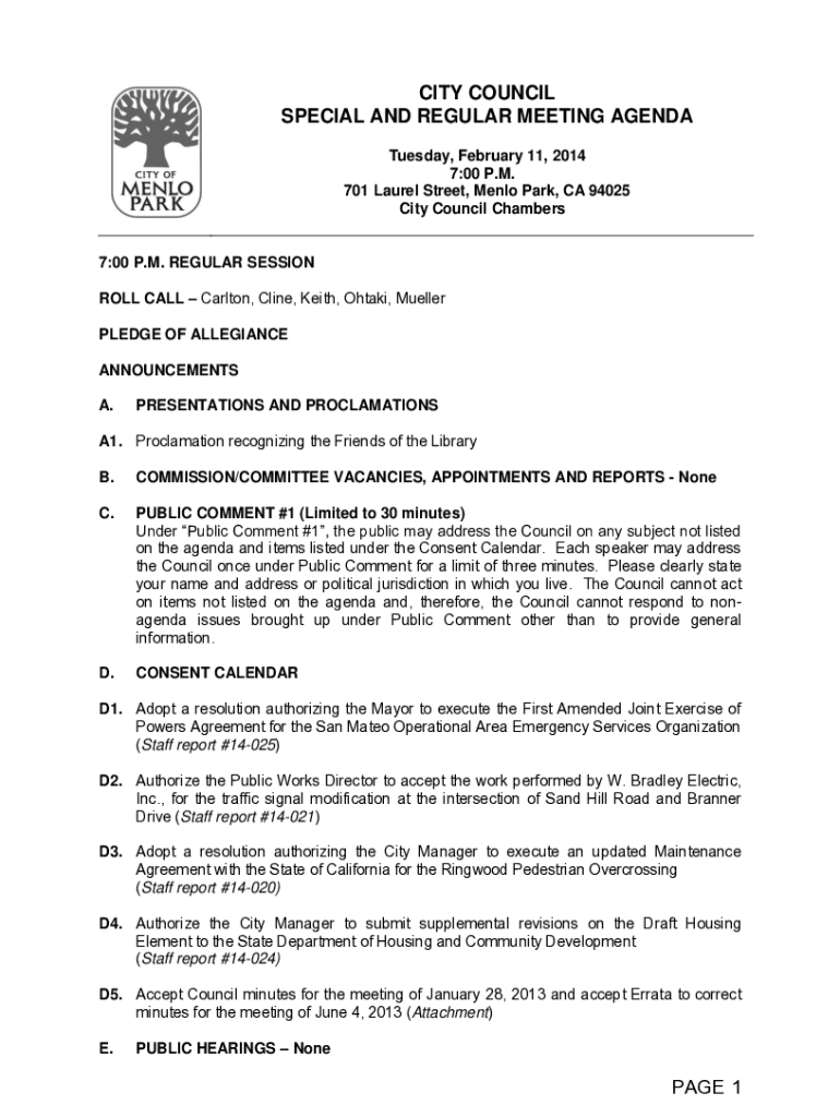 CITY COUNCIL SPECIAL AND REGULAR MEETING AGENDA Tuesday, February 11, 2014 7:00 P.M. 701 Laurel Street, Menlo Park, CA 94025 City Council Chambers7:00 P.M. REGULAR SESSION ROLL CALL Carlton, Cline,