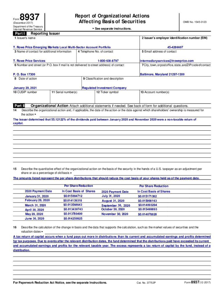 Report of Organizational Actions Affecting Basis of Securities8937Form (December 2017) Department of the Treasury Internal Revenue Serviceman BOMB No. 15450123See separate instructions. Reporting