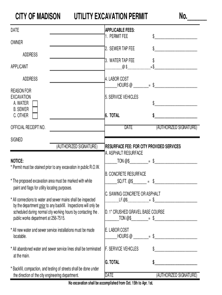 CITY OF Madison.___UTILITY EXCAVATION PERMITDATEAPPLICABLE FEES: 1. PERMIT FEET___2. SEWER TAP FEET___3. WATER TAP FEE$OWNER ADDRESS APPLICANT___@ $___ $___ADDRESS4. LABOR COST ___HOURS @ ___ $___REASON