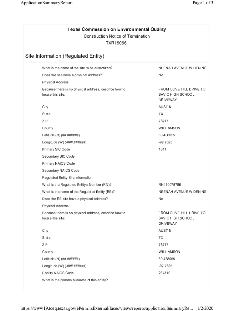 ApplicationSummaryReportPage 1 of 3Texas Commission on Environmental Quality Construction Notice of Termination TXR15056ISite Information (Regulated Entity) What is the name of the site to be authorized?NEE