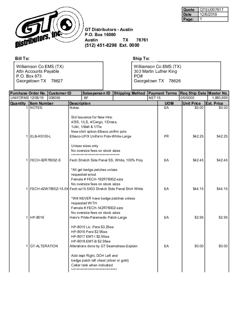 Quote Date Page:QTEU007617 12/6/2019 1GT Distributors Austin P.O. Box 16080 Austin TX 78761(512) 4518298 Ext. 0000 Bill To:Ship To:Williamson Co EMS (TX) Attn Accounts Payable P.O. Box 873 Georgetown