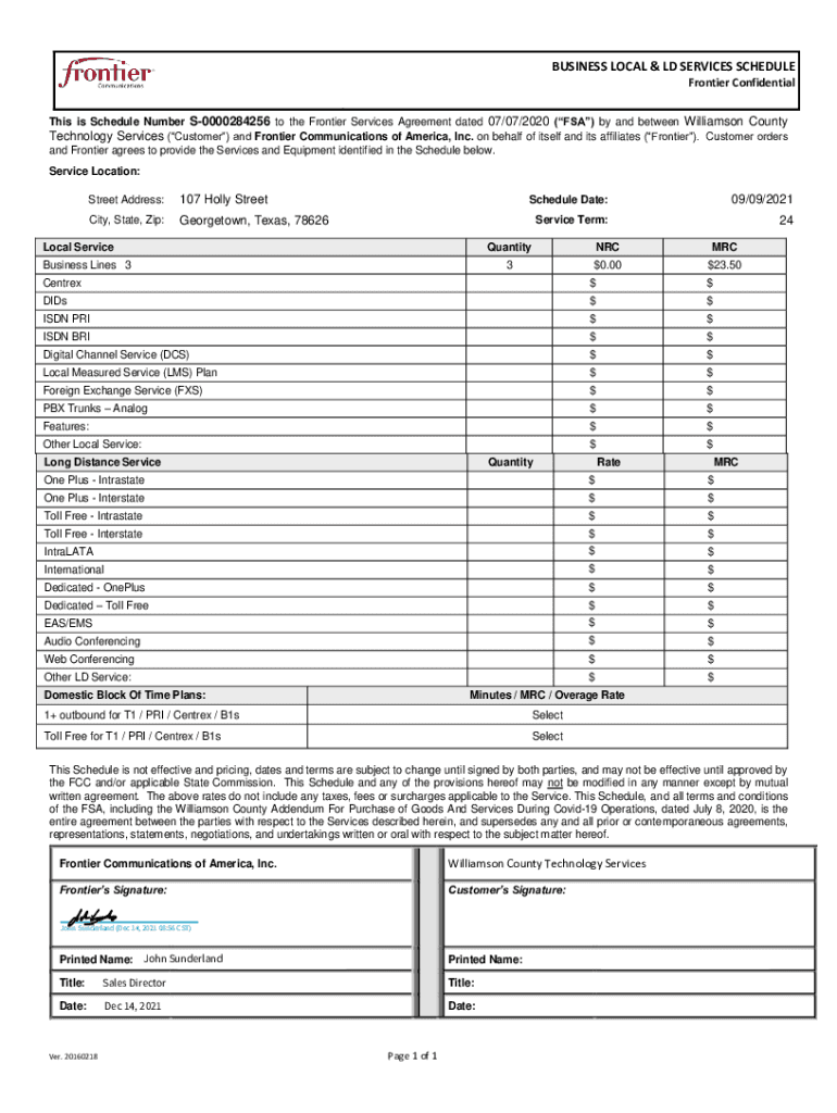 BUSINESS LOCAL & LD SERVICES SCHEDULE Frontier Confidential This is Schedule Number S0000284256 to the Frontier Services Agreement dated 07/07/2020 (FSA) by and between Williamson County Technology
