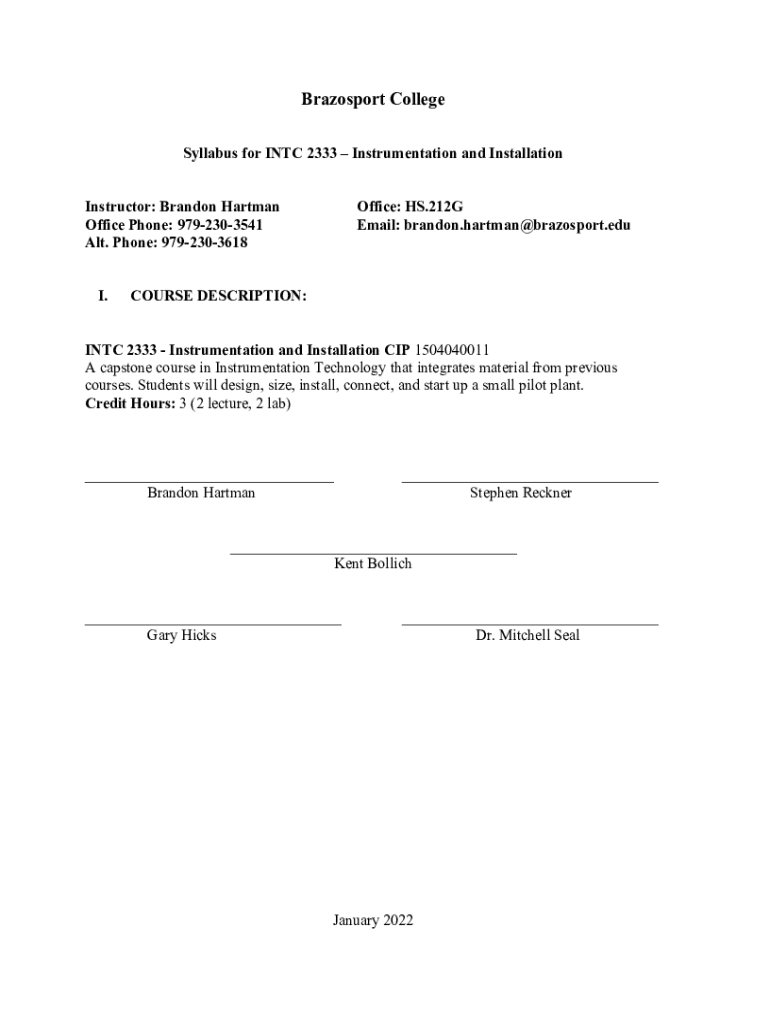 Get the free Syllabus for INTC 2333 Instrumentation and Installation