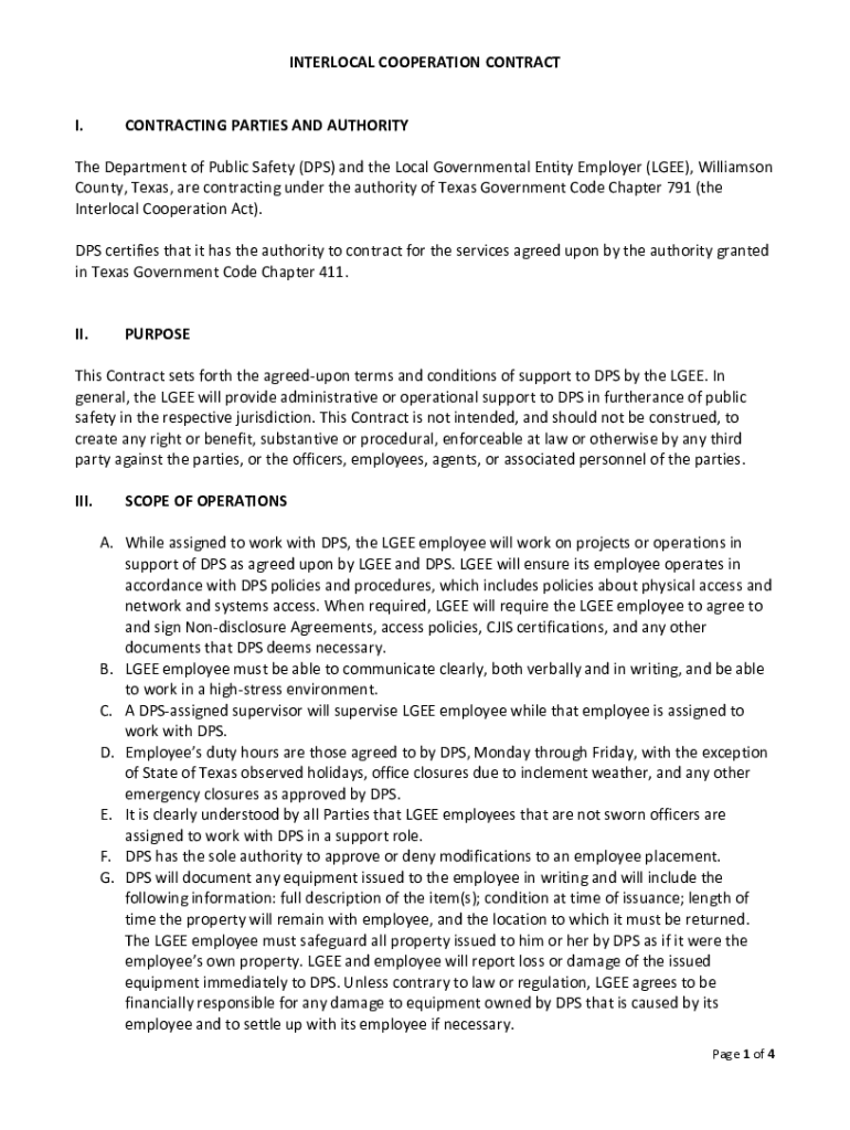 INTERLOCK COOPERATION CONTRACT I.CONTRACTING PARTIES AND Authority Department of Public Safety (DPS) and the Local Governmental Entity Employer (LEE), Williamson County, Texas, are contracting under