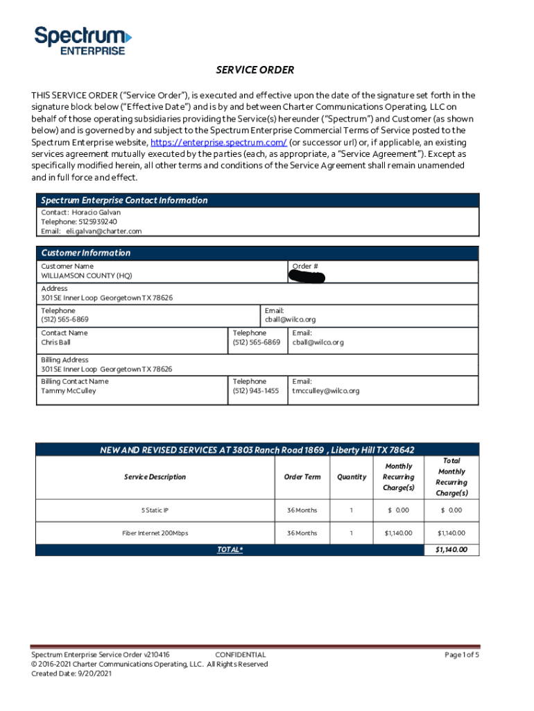 SERVICE ORDER THIS SERVICE ORDER (Service Order), is executed and effective upon the date of the signature set forth in the signature block below (Effective Date) and is by and between Charter Communications