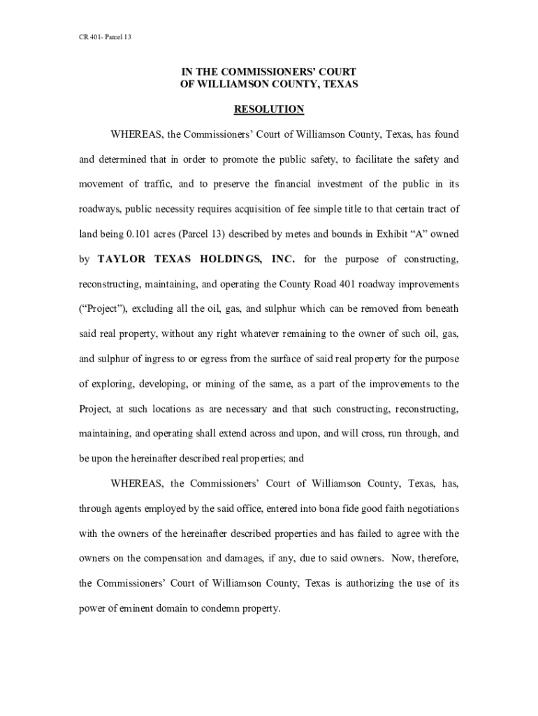 CR 401 Parcel 13IN THE COMMISSIONERS COURT OF WILLIAMSON COUNTY, TEXAS RESOLUTION WHEREAS, the Commissioners Court of Williamson County, Texas, has found and determined that in order to promote the