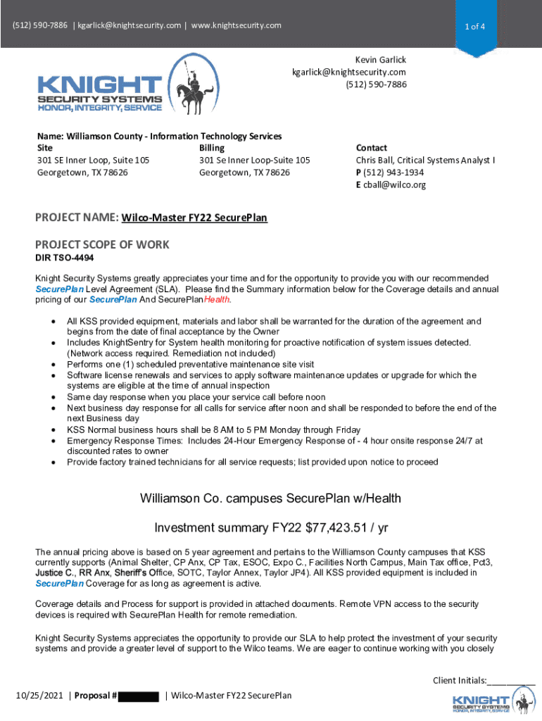 (512) 5907886 | kgarlick@knightsecurity.com | www.knightsecurity.com1 of 4Kevin Garlic kgarlick@knightsecurity.com (512) 5907886Name: Williamson County Information Technology Services Site Billing