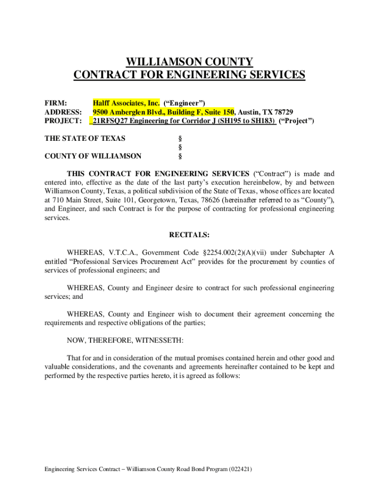 WILLIAMSON COUNTY CONTRACT FOR ENGINEERING SERVICES FIRM: Half Associates, Inc. (Engineer) ADDRESS: 9500 Amber glen Blvd., Building F, Suite 150, Austin, TX 78729 PROJECT: _21RFSQ27 Engineering for