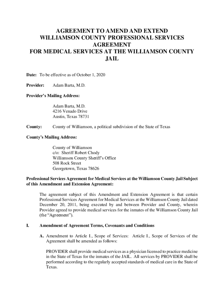 AGREEMENT TO AMEND AND EXTEND WILLIAMSON COUNTY PROFESSIONAL SERVICES AGREEMENT FOR MEDICAL SERVICES AT THE WILLIAMSON COUNTY JAIL Date: To be effective as of October 1, 2020, Provider:Adam Bart,