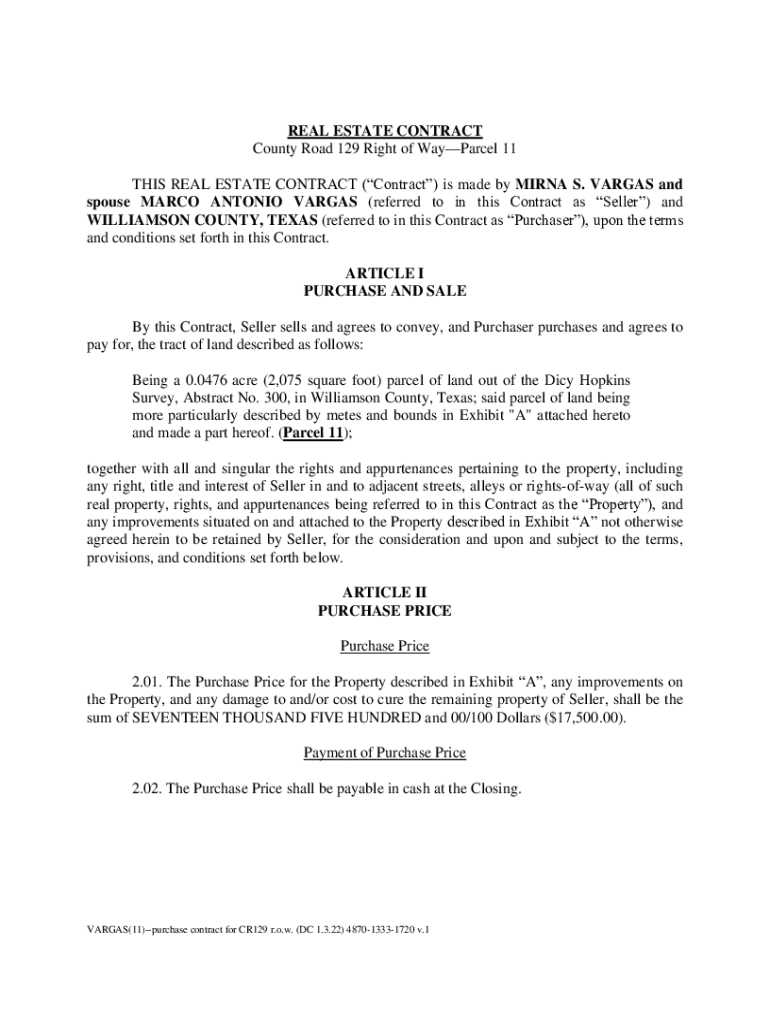 REAL ESTATE CONTRACT County Road 129 Right of Parcel 11 THIS REAL ESTATE CONTRACT (Contract) is made by miRNA S. VARGAS and spouse MARCO ANTONIO VARGAS (referred to in this Contract as Seller) and