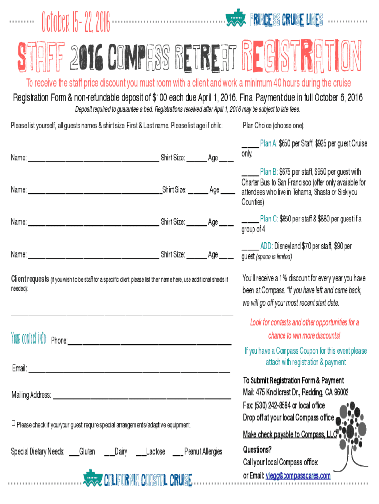 October 15 22, 2016 Staff 2016 Compass Retreat Registration Princess Cruise Lines receive the staff price discount you must room with a client and work a minimum 40 hours during the cruise Registration