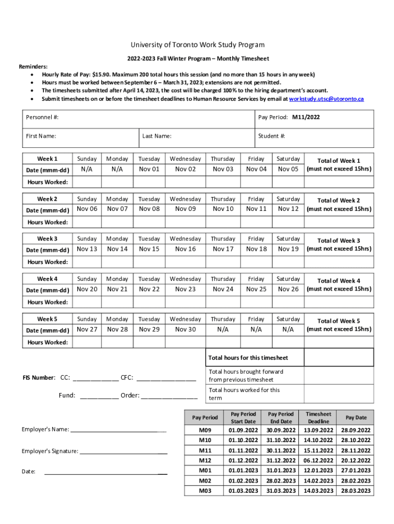 University of Toronto Work Study Program 20222023 Fall Winter Program Monthly TimesheetReminders: Hourly Rate of Pay: $15.90. Maximum 200 total hours this session (and no more than 15 hours in any