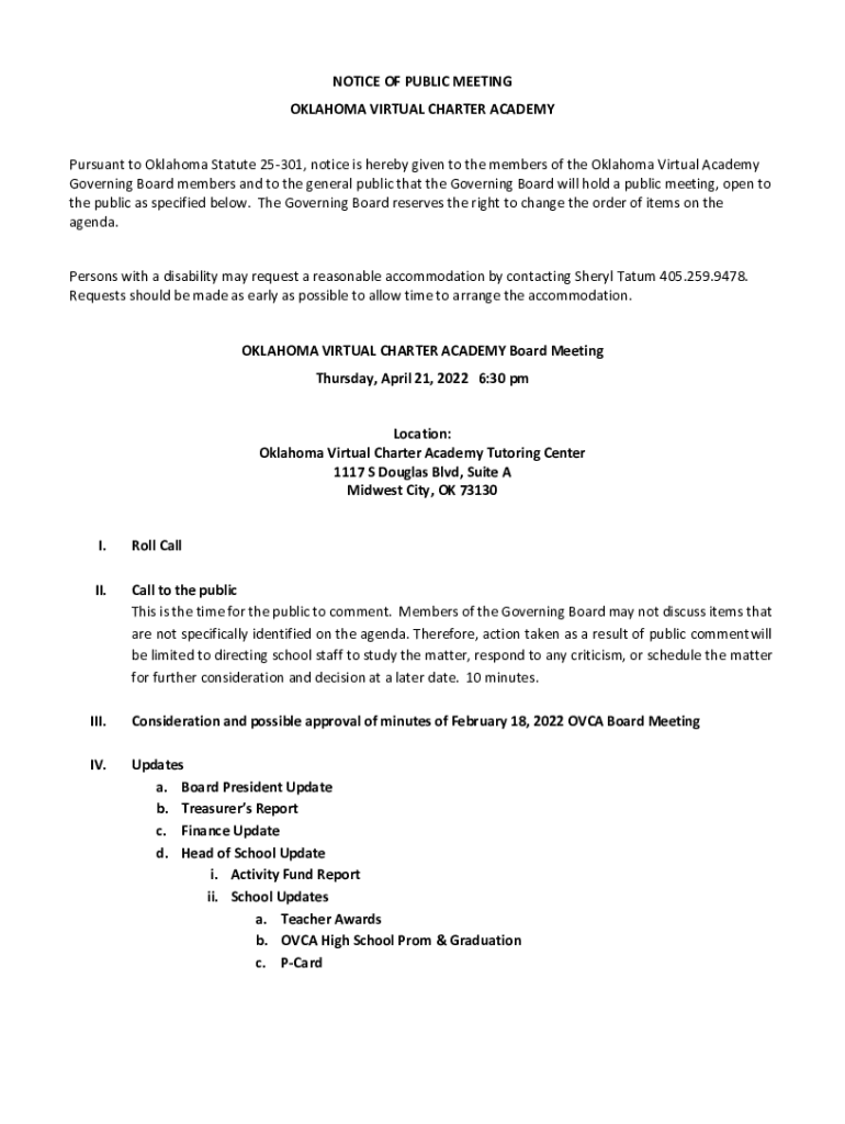 NOTICE OF PUBLIC MEETING OKLAHOMA VIRTUAL CHARTER ACADEMY Pursuant to Oklahoma Statute 25301, notice is hereby given to the members of the Oklahoma Virtual Academy Governing Board members and to the