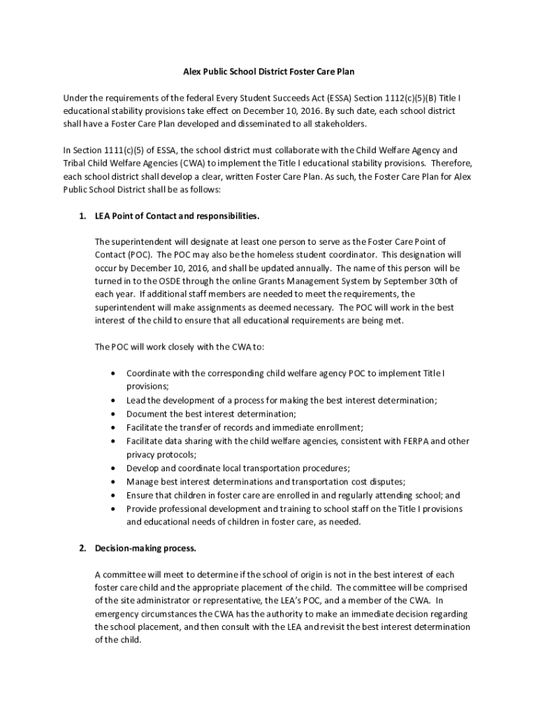Alex Public School District Foster Care Plan Under the requirements of the federal Every Student Succeeds Act (ESSAY) Section 1112(c)(5)(B) Title I educational stability provisions take effect on