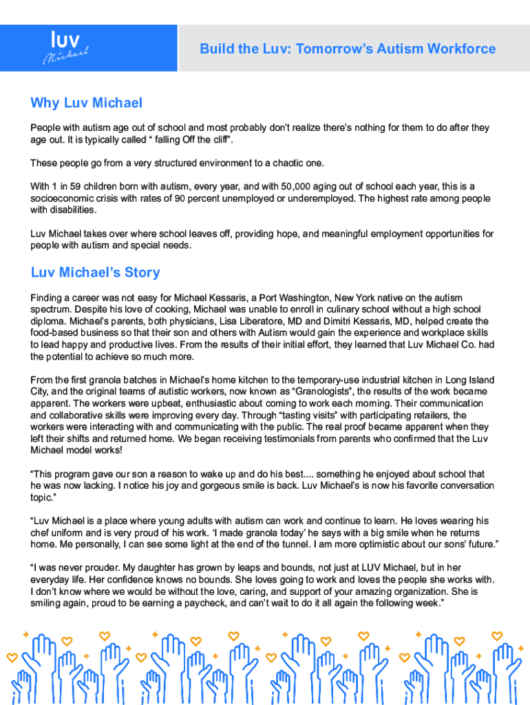 Build the Love: Tomorrow's Autism Workforce Why Love Michael People with autism age out of school and most probably don't realize there's nothing for them to do after they age out. It is typically
