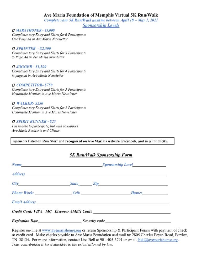 Ave Maria Foundation of Memphis Virtual 5K Run/Walk Complete your 5K Run/Walk anytime between April 18 May 1, 2021Sponsorship Levels MARATHONER $5,000Complimentary Entry and Shirts for 6 Participants