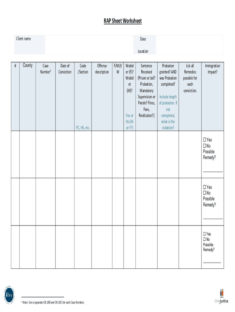 RAP Sheet Worksheet Client namesake Location#County Case Number1Date of ConvictionCode /Section PC, HS, etc. Offense description/M/I/ Wobble her (F)? Wobble ET (M)? Yes or No (M or F?) Sentence Received