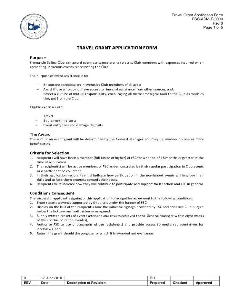 Travel Grant Application Form FSCADMF0009 Rev 0-Page 1 of 5TRAVEL GRANT APPLICATION FORM Purpose Fremantle Sailing Club can award event assistance grants to assist Club members with expenses incurred