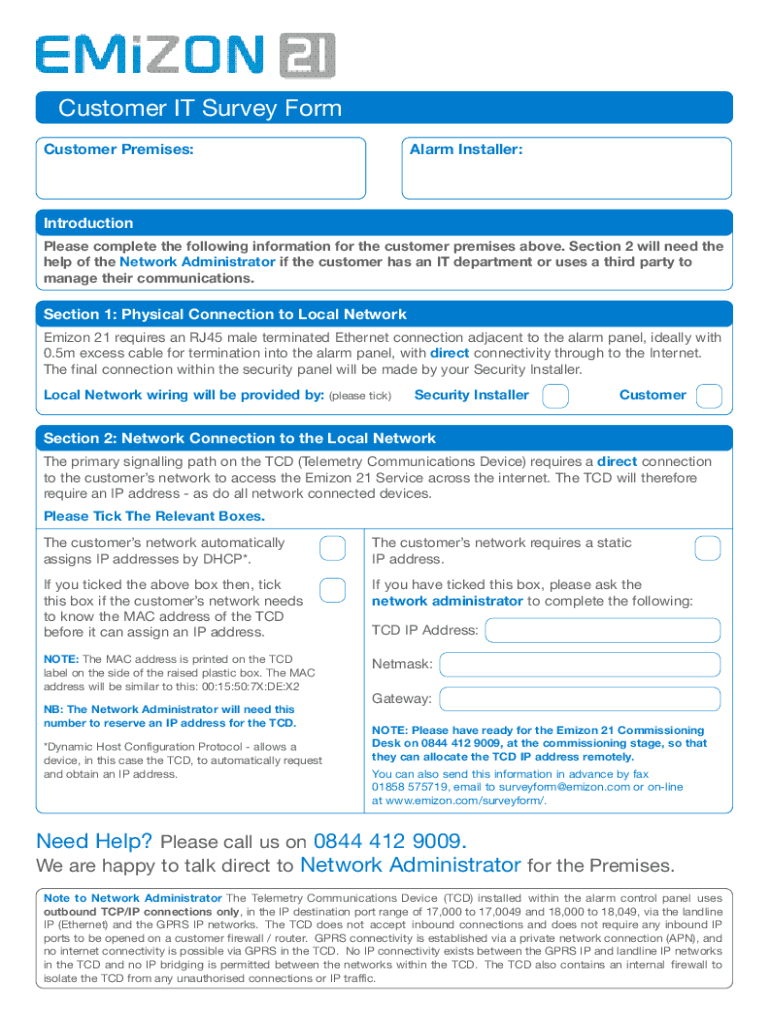 Customer IT Survey Form Customer Premises:Alarm Installer:Introduction Please complete the following information for the customer premises above. Section 2 will need the help of the Network Administrator