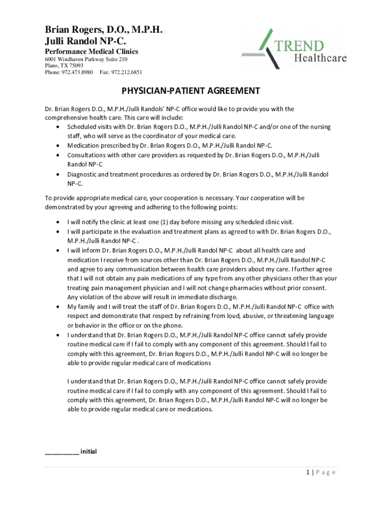 Brian Rogers, D.O., M.P.H. July Random NPC. Performance Medical Clinics 6001 Wind haven Parkway Suite 210 Plano, TX 75093 Phone: 972.473.8980 Fax: 972.212.6851PHYSICIANPATIENT AGREEMENT Dr. Brian